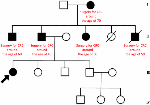 Family tree. Five people were affected with colorectal cancer in the first degree relatives of the patient’s father among three generations. Lynch syndrome was diagnosed, which fully met the diagnostic criteria of Amsterdam II. Squares and circles indicate male and female, respectively. Arrow indicates the patient. Filling with black indicates affected person with trait. Diagonal line indicates deceased relatives. CRC colorectal cancer