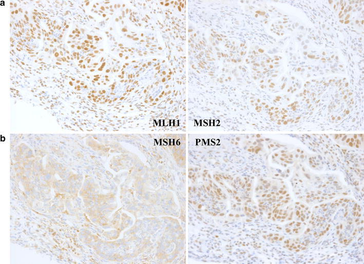 IHC for MMR proteins using the colon cancer specimen. a, b IHC studies for MLH1 (left upper panels), MSH2 (right upper panels), MSH6 (left lower panels), and PMS2 (right lower panels). Whereas MLH1, MSH2, and PMS2 showed the nuclear staining pattern, MSH6 did not. Left lower panel Cytoplasmic weak and blur staining was regarded as non-specific compared to other positive and negative controls