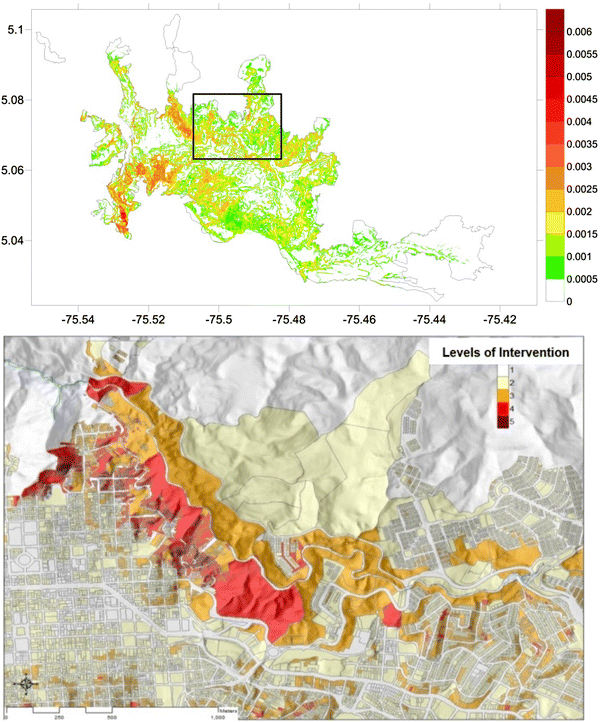 In 2003, Manizales implemented an emergency response plan (Manizales 2016a) that was updated in 2016 as the municipal strategy for emergency response (Manizales 2016b), following also the requirements of Law 1523 of 2012 (Congreso de Colombia 2012). The new version of this plan, enacted by the city’s decree 416 of 2016, considers different hazard events, such as moderate and strong earthquakes, volcanic eruptions, floods, and landslides triggered by quakes and rain, that have been analyzed through the Table 2 multi-hazard risk assessment mechanism and that define the city’s preparedness and the interagency ability to respond in case of disaster (Cardona et al. 2016b).
