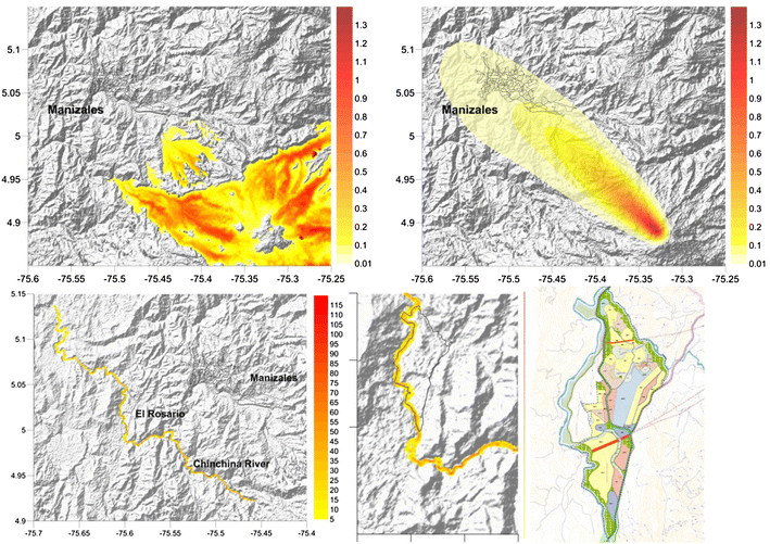 Top left PDC dynamic pressure hazard map (in Pascals). Top right Ash fall thickness for the worst-case scenario eruption of Nevado del Ruiz (in meters). Bottom left Lahar hazard inundation map of the Chinchiná River (in meters). Bottom center Zoom to the El Rosario expansion area of Manizales. Bottom right Lineal parks and land-use planning of El Rosario.