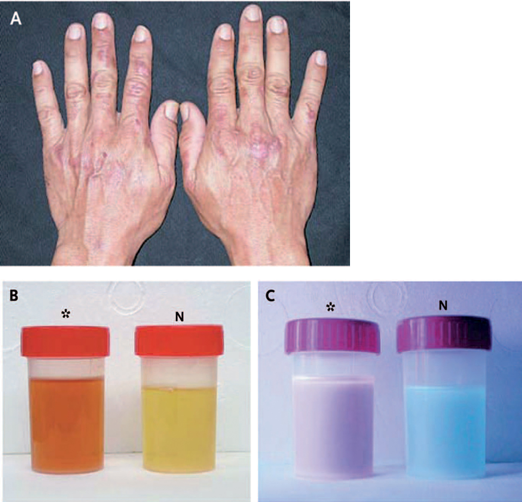 Hautläsionen (A) und Urin im Normal- (B) und UV-Licht (C). Stern: Patientenurin, N: normaler Urin zum Vergleich.