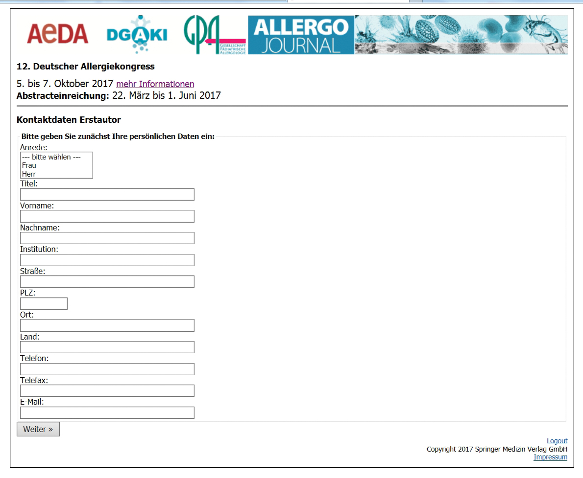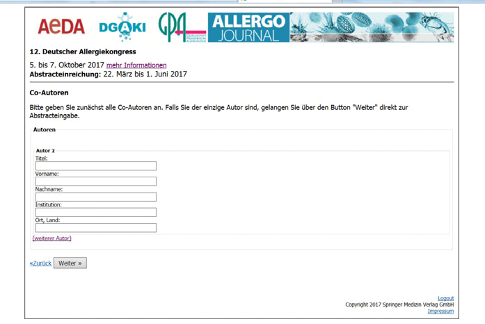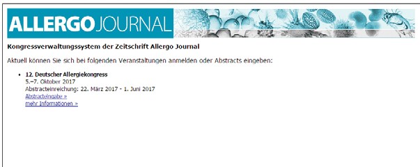1. Unter der Adresse http://abstracts.allergo-journal.de finden Sie das Kongressverwaltungssystem des Allergo Journal. Wählen Sie den Allergiekongress 2017 aus und klicken Sie auf den Link „Abstracteingabe“. Beim folgenden Login geben Sie bitte ein: