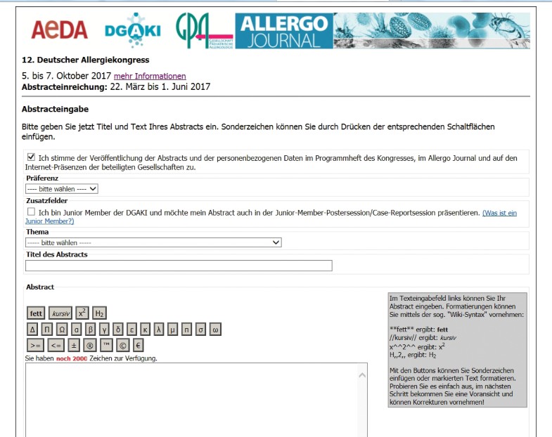 Wissenschaftliche Beiträge, die beim 12. Deutschen Allergiekongress in Wiesbaden als Vorträge oder Poster präsentiert werden sollen, müssen bis zum 1. Juni 2017 als Abstract eingereicht werden. Alle angenommenen Abstracts werden im Allergo Journal publiziert. Die Abstracteinreichung erfolgt ausschließlich online. Die folgende Schritt-für-Schritt-Anleitung soll Ihnen die Eingabe erleichtern.
