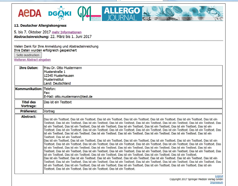 5. Im letzten Schritt können Sie alle Eingaben nochmals kontrollieren. Bitte beachten Sie, dass Ihr Abstract genau so gedruckt wird, wie es eingegeben wurde. Falls Sie noch Fehler entdecken, gelangen Sie durch einen Klick auf Zurück wieder in den Überarbeitungsmodus. Wenn alles richtig ist, klicken Sie auf OK, Speichern. Wenn Sie das Bild unten sehen, haben Sie Ihre Daten erfolgreich zum Allergiekongress 2017 eingereicht. Für Ihre Unterlagen sollten Sie sich diese Seite ausdrucken.