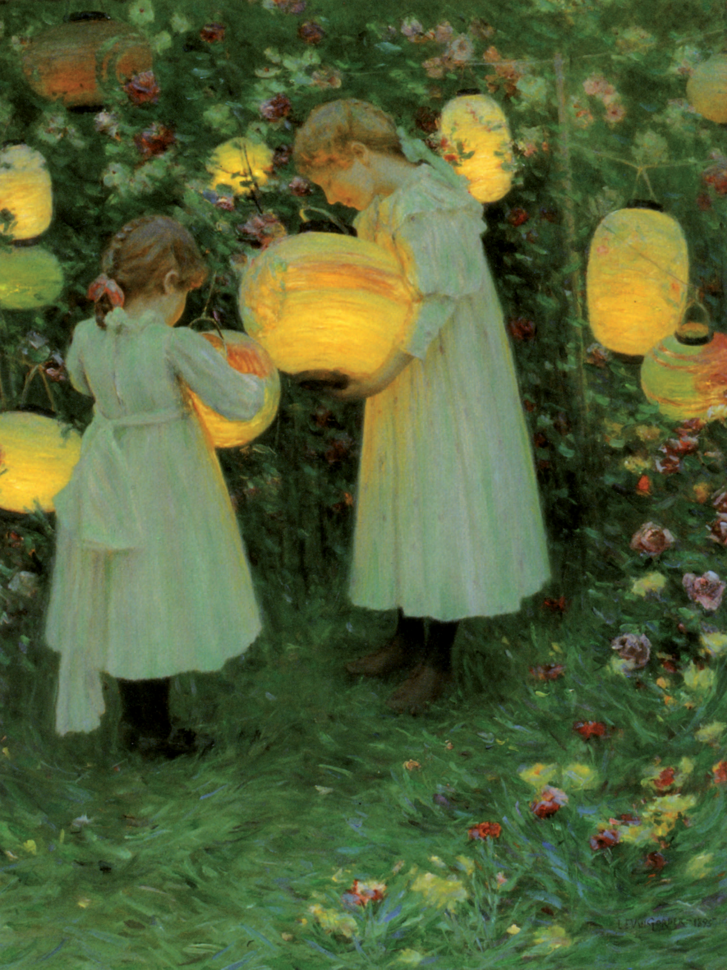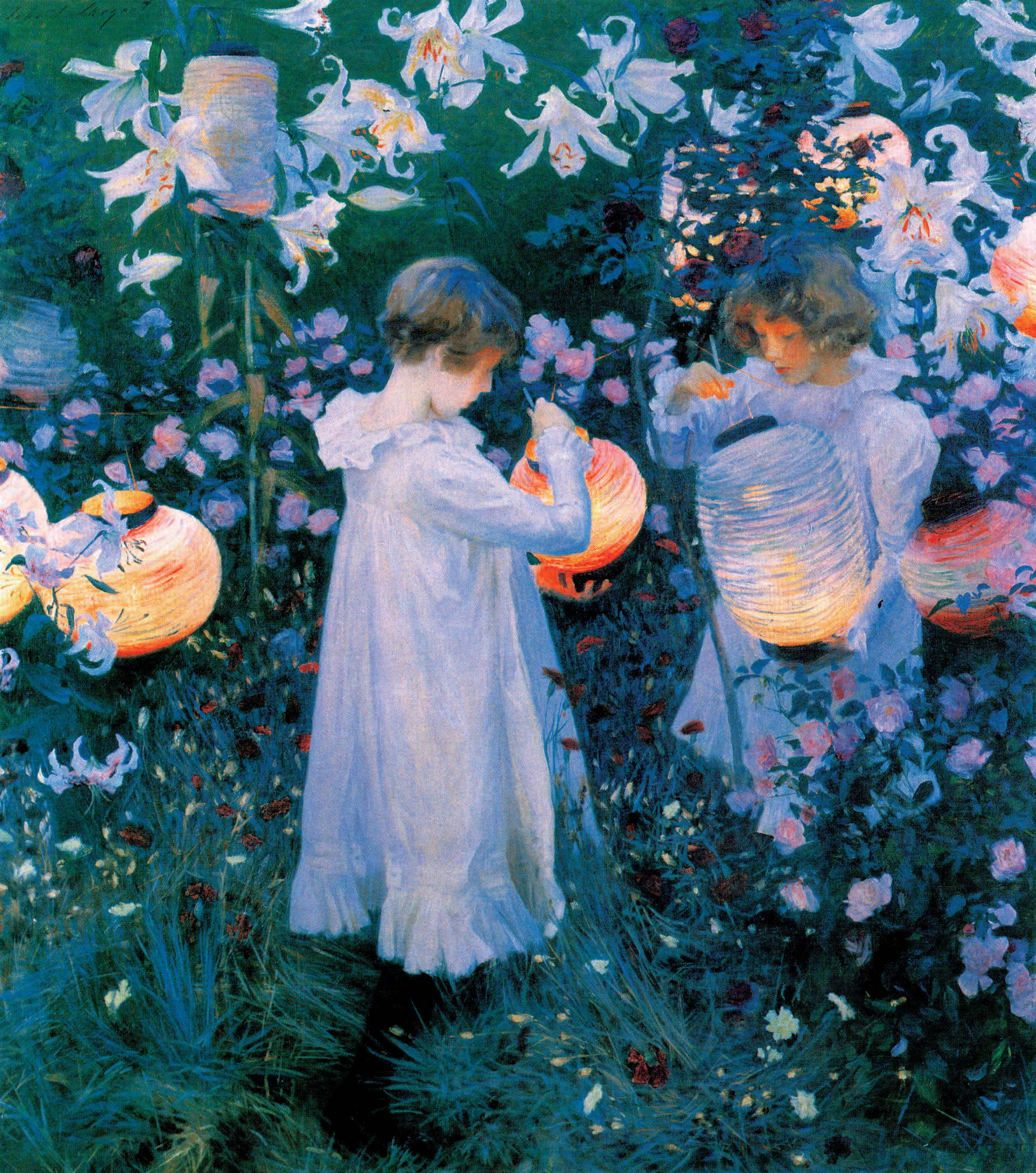 Bereits vor der Jahrhundertwende war man in Europa begeistert von Japan und ganz besonders die Maler entdeckten zu der Zeit japanische Themen. Das hinreißende Gemälde „Nelke, Lilie, Lilie, Rose“ („Carnation, Lily, Lily, Rose“) wurde 1885 vom amerikanischen Impressionisten John Singer Sargent angefertigt, im gleichen Stil wie später der amerikanische Postimpressionist Luther E. van Gorder mit „Japanische Laternen“. Beide hatten an der gleichen Akademie studiert und kannten sich daher. Sargent kam die Idee zu seinem Bild mit dem poetischen Namen „Nelke, Lilie, Lilie, Rose“, der an einen Abzählvers erinnert, auf einer Bootsfahrt auf der Themse. Es handelt sich hier nicht um ein typisches Kinderporträt wie ein ähnliches Gemälde, das von großen Lilien dominierte „Garden Study of the Vickers Children“ (1884). Die beiden Mädchen entzünden in der Abenddämmerung in ihren langen weißen feinen Kleidern ihre japanischen Lampions in einem englischen Garten. Das Licht beleuchtet ihre Gesichter und Kleider. Und weitere an einer Schnur hängende rötlich schimmernde Laternen lassen die Blumen, neben Nelken und Rosen insbesondere die Lilien, über ihren Köpfen im hellen Licht erscheinen. Dieses Gemälde wurde 1887 enthusiastisch auf der Ausstellung der Royal Academy of London gefeiert und festigte den Ruhm Sargents.