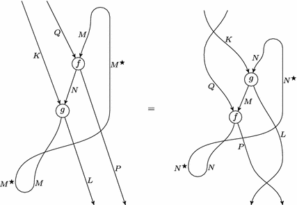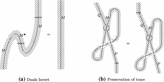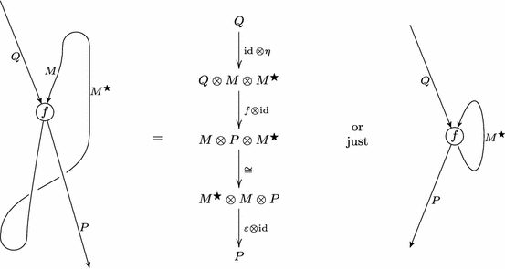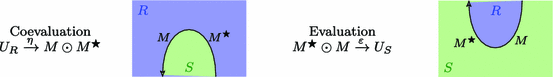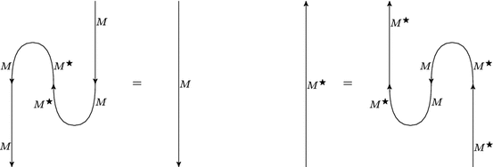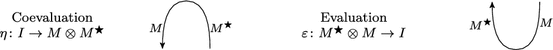 satisfying the triangle identities \((\text{ id}_M \otimes \varepsilon )(\eta \otimes \text{ id}_M) \,{=}\, \text{ id}_M\) and \((\varepsilon \otimes \text{ id}_{M^{\star }}) (\text{ id}_{M^{\star }} \otimes \eta ) = \text{ id}_{M^{\star }}\). We call \(\varepsilon \) the evaluation and \(\eta \) the coevaluation.