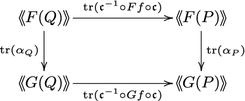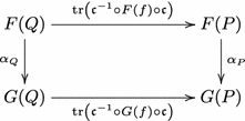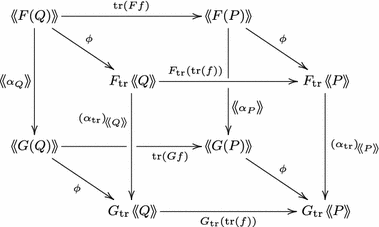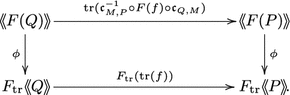 - (ii)Then for any map \(f:Q\otimes M \rightarrow M\otimes P\), we have$$\begin{aligned} F(\mathrm{tr }(f)) = \mathrm{tr }\left(\mathfrak c ^{-1} \circ F(f)\circ \mathfrak c \right). \end{aligned}$$(2.3)