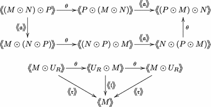 - Natural isomorphismssatisfying the same coherence axioms as for a monoidal category.$$\begin{aligned} \mathfrak a :M\odot (N\odot P)&\overset{\cong }{\longrightarrow } (M\odot N)\odot P\\ \mathfrak l :U_R \odot M&\overset{\cong }{\longrightarrow } M\\ \mathfrak r :M\odot U_S&\overset{\cong }{\longrightarrow } M \end{aligned}$$