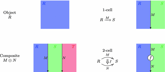 We call the objects of \(\fancyscript{B}(R,S)\) 1-cells and its morphisms 2-cells. We regard 1-cells and 2-cells in a bicategory as analogous to the objects and morphisms in a monoidal category, respectively, with the 0-cells playing a “bookkeeping” role informing us which 1-cells can be tensored with which others. We often write a 1-cell \(M\in \fancyscript{B}(R,S)\) as \(M:R \shortmid \!\!\!\rightarrow S\) to distinguish it from a 2-cell \(f:M\rightarrow N\).