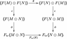 - (ii)If, furthermore, \(\mathfrak c _{M,P}:F(M)\odot F(P)\rightarrow F(M\odot P)\) is an isomorphism, then for any \(f:Q\odot M\rightarrow M\odot P\), the following square commutes: