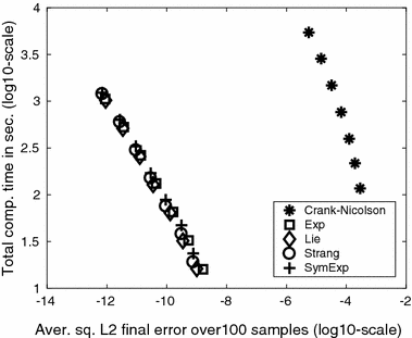 We see that all numerical methods but the Crank–Nicolson method actually behave rather similarly for small time steps, since the points we obtain are almost aligned. The fact that the Crank–Nicolson method behaves a rather differently to the other four methods can be explained mainly by the fact that it is the only numerical method in this test that does not integrate the linear stochastic part of the equation exactly (as noticed in the analysis of the convergence plots in Sect. 4.1.1 above). Note that if one takes more complicated space geometries or space discretisations (and not equispaced points on a finite interval that allow using FFT) so that the linear part of the equation can no longer be integrated exactly, then the numerical cost of the other four numerical methods may be of the same order as that of the Crank–Nicolson method.