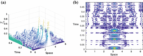 Space-time evolution and contour plot for the exponential integrator (3.3). The discretisation parameters are \(h=2^{-14}\) and \(M=2^8\). a Space-time evolution, b contour plot