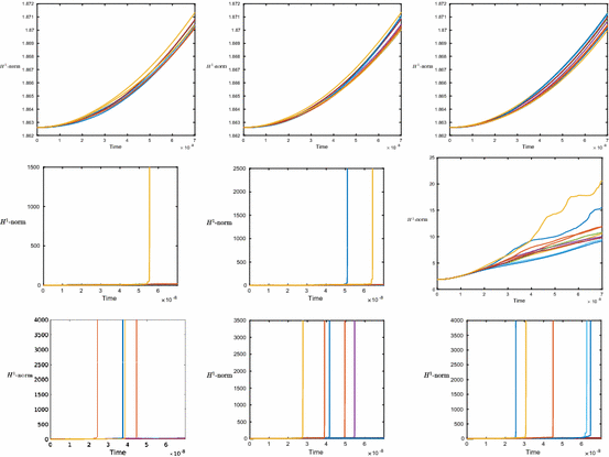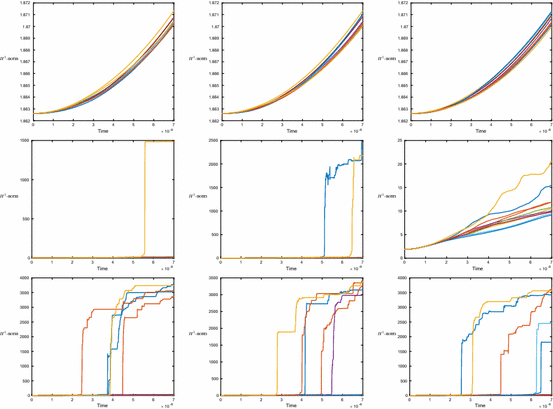- 2.The Lie–Trotter splittingfrom [26]. Here, \(Y(h)u_*\) denotes the value at time h of flow associated to the problem \(\mathrm {i}\frac{\partial u}{\partial t}+|u|^{2\sigma }u=0\) with initial datum \(u_*\);$$\begin{aligned} u_*&=S(t_{n+1},t_n)u_n\nonumber \\ u_{n+1}&=Y(h)u_* \end{aligned}$$(4.1)