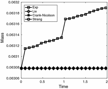 Preservation of the \(L^2\)-norm: exponential integrator (square), Lie–Trotter (diamond), Crank–Nicolson (asterisk), Strang (circle)