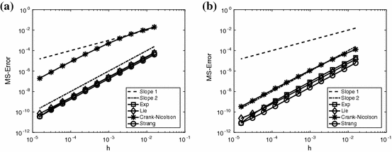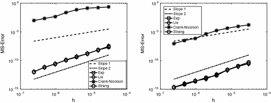- 3.The Strang splittingwhere again Y(h) is defined as above;$$\begin{aligned} u_*&=S(t_n+h/2,t_n)u_n\nonumber \\ {\widehat{u}}&=Y(h)u_*\nonumber \\ u_{n+1}&=S(t_{n+1},t_n+h/2){\widehat{u}}, \end{aligned}$$(4.2)