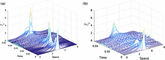 - 4.The implicit Crank–Nicolson schemefrom [3]. Here, we have set \(u_{n+1/2}=\frac{1}{2}(u_n+u_{n+1})\), \(\chi _n=\frac{\beta (t_{n+1})-\beta (t_n)}{\sqrt{h}}\) and \(g(u,v)=\frac{1}{\sigma +1}\left( \frac{|u|^{2\sigma +2}-|v|^{2\sigma +2}}{|u|^2-|v|^2}\right) \left( \frac{u+v}{2}\right) \).$$\begin{aligned} \mathrm {i}\frac{u_{n+1}-u_n}{h}+\frac{\chi _n}{\sqrt{h}}\Delta u_{n+1/2}+g(u_n,u_{n+1})=0 \end{aligned}$$(4.3)