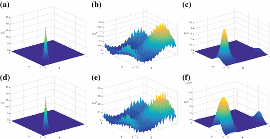 Snapshots of the evolution of the exponential integrator in 2d: \(\sigma =1.9\) (up) and \(\sigma =2\) (bottom). Discretisation parameters: \(h=2^{-11}\) and \(M=2^7\). Note the scale on the z-axis on (f). a Snapshot at time 0, b snapshot at time 0.049, c Snapshot at time 0.105, d Snapshot at time 0, e Snapshot at time 0.049, f Snapshot at time 0.105