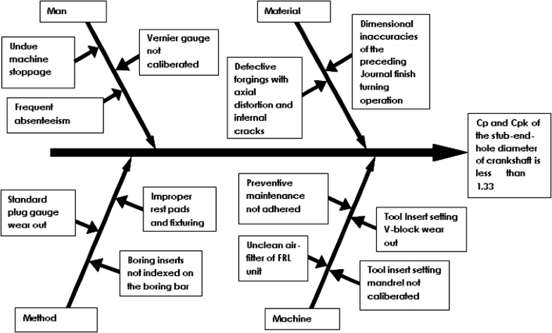 | To achieve the process potential capability index and process performance capability index, i.e., CP and CPK values for the stub end hole boring operation of the crankshaft to be >1.33, i.e., more than 4 sigma levels | ||