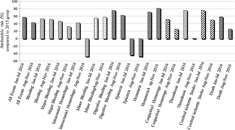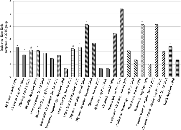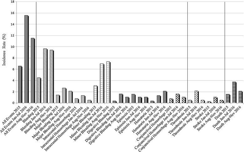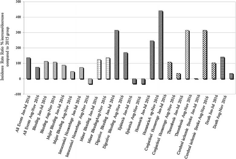 The results show a significant rise of the incidence rate ratio in patients undergoing VKA treatment during the period 15 January to 15 July 2016 compared to the previous one regarding total bleeding, especially for minor bleeding and digestive bleeding; thromboembolic events; and all-death cause.