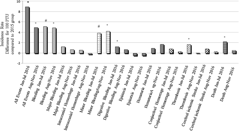 Incidence rate difference calculated among the several organizational models. The 2016 groups, Jan–Jul and Aug–Nov, were compared to the 2015 group. These results evidence an increased risk of adverse events directly attributable to an organizational model that does not provide a direct analytical and clinical control by the surveillance center on patients undergoing VKA treatments. *p < 0.001; # p < 0.01; °p < 0.05
