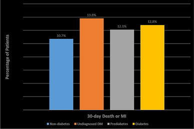 The endpoint of 30-day death, MI, or RIUR was more frequent, however, in both the undiagnosed and known diabetes groups compared with normal patients. All-cause mortality at 30 days among patients with known diabetes and undiagnosed diabetes was more frequent than among normal patients, but similar among prediabetic and normal patients. Survival analyses confirmed that 1-year mortality among patients with known diabetes was significantly greater than among normal patients, even after adjustments for confounding factors [1••].
