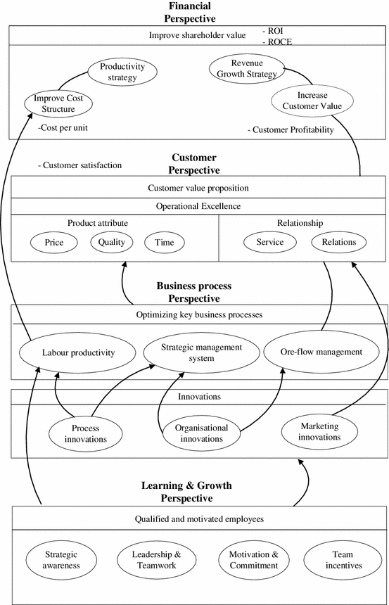 The processes most critical for the organization strategy to succeed were identified. The business process management system was set as the main strategic goal. This should be achieved by improving company’s standards for all business processes according to best practice. The second strategic goal was an internal perspective of optimizing the ore flow creation process, which should lead to customer satisfaction in the final product. The last strategic goal for the internal business perspective is increasing labor productivity and, as a result reducing the number of employees and improving cost structure by decreasing expenses. Innovations were determined as drivers for proposed improvements.