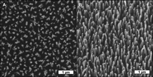 Scanning electron microscopy (SEM) images of vertically aligned MWCNTs of an approximate length of 2 µm and 80–200 nm diameter in a top and b 20° tilt perspective