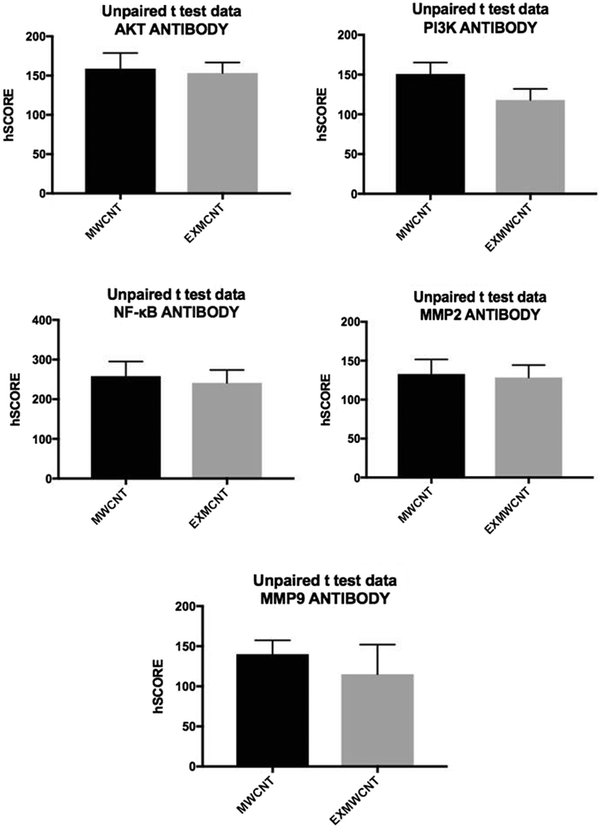 Comparison of H-score values of PI3K, AKT, NFKP, MMP2 and MMP9 primer antibodies in MDA-MB-231 cells on MWCNT and EXMWCNT cultures. There are not any differences between these groups except for the PI3K values