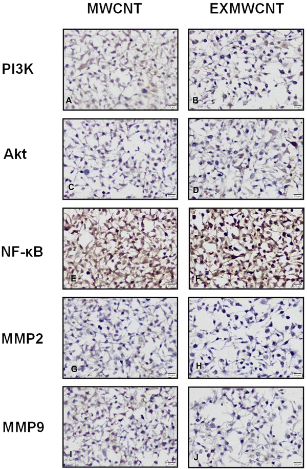 Immunohistochemical analysis of MDA-MB-231 cells adhering to multi-walled carbon nanotube-based scaffold (a, c, e, g, i) and in the absence of MWCNTs-based scaffold (b, d, f, h, j). Moderate PI3K (a, b), Akt (c, d), MMP2 (g, h) and MMP9 (i, j) expressions were seen in both MWCNTs and EXMWCNTs scaffolds. Strong NF-κB (e, f) immunoreactivity was seen by MDA-MB-231 cells on the MWCNTs and EXMWCNTs scaffolds (original magnification: ×200.)