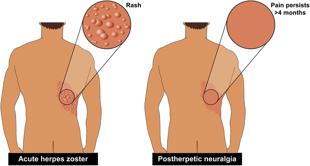 Left image shows typical presentation of acute herpes zoster. Right image illustrates typical presentation of postherpetic neuralgia, with pain persisting >4 months after the acute rash, which may have completely disappeared or left scant scarring