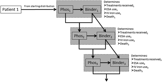 Schematic of the microsimulation model. At study start, the patient is probabilistically assigned a starting serum phosphate level (Phos1) based on the empiric distribution of phosphate levels that immediately preceded phosphate binder initiation. The phosphate binder dose strength for cycle 1 (Binder1) is assigned probabilistically conditional on Phos1. Phos1 and Binder1 determine the patient’s health state for cycle 1, which probabilistically determines the number of dialysis treatments received during the period (Treatments received1), the total dose of ESA and IV iron received during cycle 1 (ESA use1 and IV iron use1) and the probability of death during cycle 1 (Death1). For patients who survive cycle 1, a change in phosphate between cycle 1 and cycle 2 is probabilistically sampled based on Phos1 and Binder1; this is added to Phos1 to give serum phosphate in cycle 2 (Phos2). A change in phosphate binder strength at the start of cycle 2 is probabilistically sampled conditional on Phos2 and Binder1; this is added to Binder1 to give binder strength in cycle 2 (Binder2). Phos2 and Binder2 then define the health state for cycle 2. This process iterates forward. ESA erythropoiesis-stimulating agent, IV intravenous