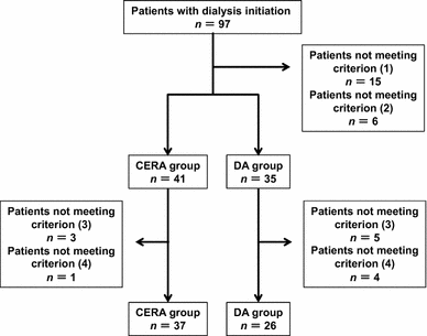 Participants were selected from 97 patients with CKD at the pre-dialysis stage who had been receiving outpatient care and initiated dialysis at the facilities participating in this study between January 2012 and December 2014. Patients who met the selection criteria outlined below were selected and divided into CERA (37 participants) and DA (26 participants) groups. CERA and DA were administered according to the approved dosage and administration interval in Japan. In addition, all participants in the present study were injected with ESA subcutaneously. The administration interval of ESA in most of participants was once every 4 weeks and there was no significant difference in the administration frequency between the CERA and DA groups. The criteria of the frequency and dosage of CERA and DA were decided by the attending physician, taking the clinical situation into consideration. Based on the 2008 Japanese Society for Dialysis Therapy: Guidelines for Renal Anemia in Chronic Kidney Disease [14], the target hemoglobin level range was from 11.0 to 13.0 g/dL, and iron was administered to patients with TSAT ≤20% and ferritin ≤100 ng/mL. Iron was generally given by oral administration.