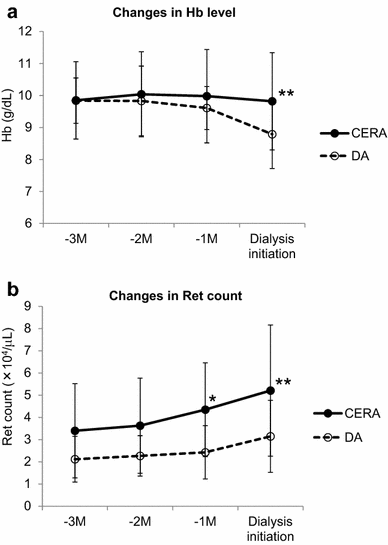 a Changes in Hb level during 3 months before dialysis initiation; Hb level was significantly higher in the CERA group than in the DA group at dialysis initiation. b Changes in Ret count during 3 months before dialysis initiation; Ret count was significantly higher in the CERA group than in the DA group during 1 month before dialysis initiation. CERA continuous erythropoietin receptor activator, DA darbepoetin-α, Hb hemoglobin, Ret reticulocyte, *P < 0.05 and **P < 0.01 vs. DA