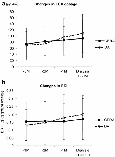 a Changes in ESA dosage during 3 months before dialysis initiation; no significant difference was found between the two groups in the ESA dosage during 3 months before dialysis initiation. b Changes in ERI during 3 months before dialysis initiation; no significant difference was found between the two groups in the ERI during 3 months before dialysis initiation. CERA continuous erythropoietin receptor activator, DA darbepoetin-α, ERI erythropoietin resistance index, ESA erythropoiesis-stimulating agent