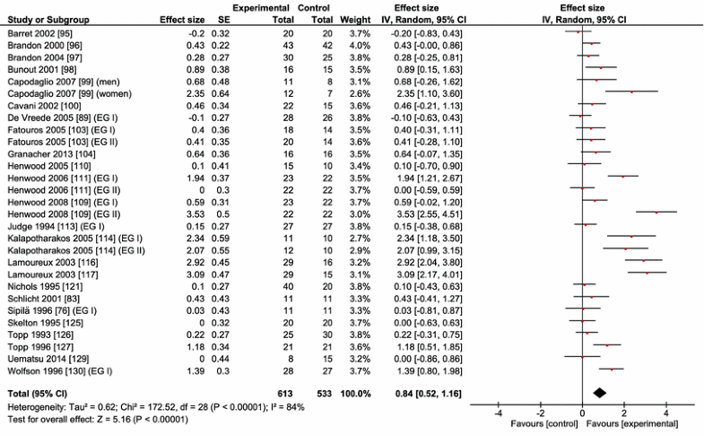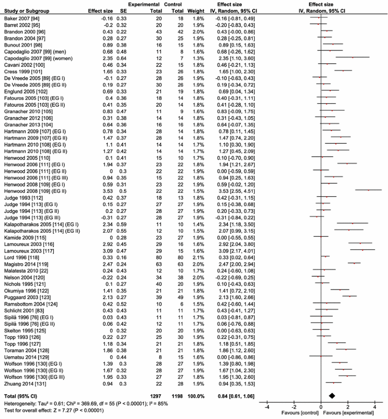 Data are also lacking in the gait reviews published so far concerning critical aspects of the gait speed tests. Previous reviews did not categorize or used only a narrow range of distance walked during the gait speed tests (<15 m) [4]. While the patterns of change in 20-m and 20-min walks were similar over an observation period of 8 years [80], it remains unclear and unexplored whether therapeutic exercise interventions would have a homogenous effect on gait speed measured over a short and long distance, each indexing different physiological mechanisms [81]. Currently, information is insufficient for a concept-based hypothesis concerning distance walked during the gait test (short vs. long). Finally, it is equally unclear from the existing literature whether exercise interventions would have a differential effect on gait performance tested at a habitual and fast (‘maximal’) pace. One review, based on limited data, reported zero intervention effects on the fast gait speed of old adults [64], contradicting results of several studies, reporting that strength and endurance training significantly increased the fast gait speed of healthy old adults [76, 82, 83, 84]. Because fast compared with habitual walking requires greater limb accelerations produced by muscle forces, our tentative hypothesis is that interventions would be more effective in improving the fast gait speed than the habitual gait speed of healthy old adults. Taken, together, the second aim of the review was to determine the effects of strength, power, coordination, and multimodal exercise interventions on gait speed measured over a short versus a long distance and at a habitual and fast pace. As a forewarning, we state that the search identified only one power training study, therefore the subsequent analyses focused only on the effects of resistance, coordination, and multimodal training on gait speed.