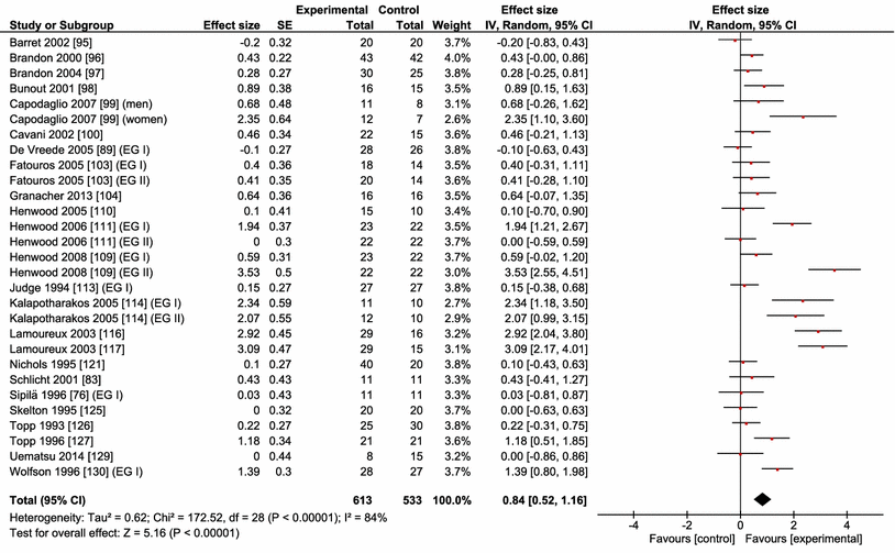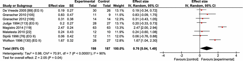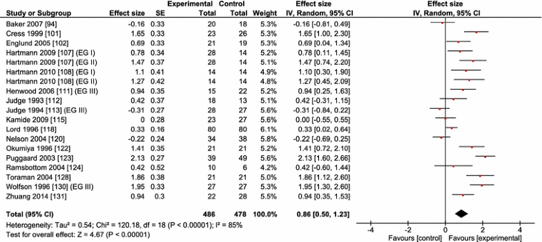 To determine the effectiveness of an exercise intervention in relation to gait speed, we computed between-subject effect size (ES) using the implemented formula in Review Manager version 5.3 (Hedges’ adjusted g) as (ES = ±[(mean post-value intervention group) − (mean post-value control group)]/pooled variance) [91]. ESs were calculated only for those comparisons that involved an experimental group and what we refer to as a ‘passive’ or ‘inactive’ control group and was adjusted for respective sample sizes. We used such control groups so that we could consistently determine the effects of an exercise intervention relative to a non-exercise control instead of another intervention group. In addition, weighting of the studies was applied in Review Manager version 5.3 according to the magnitude of the respective standard error. We used the random-effect meta-analysis model in Review Manager to compute overall ESs [92]. Increases in gait speed are reported as a positive change, and such changes are referenced to non-intervention controls so that a positive change in gait speed represents the superiority of an intervention compared with control. The calculation of ES makes it possible to conduct a systematic and quantitative evaluation whether or not exercise interventions versus control interventions affect gait speed and, if so, whether these differences are also of practical importance. ES values of 0.00 ≤ 0.49 indicate small, 0.50 ≤ 0.79 indicate medium, and ≥0.80 indicate large practical effects [93].