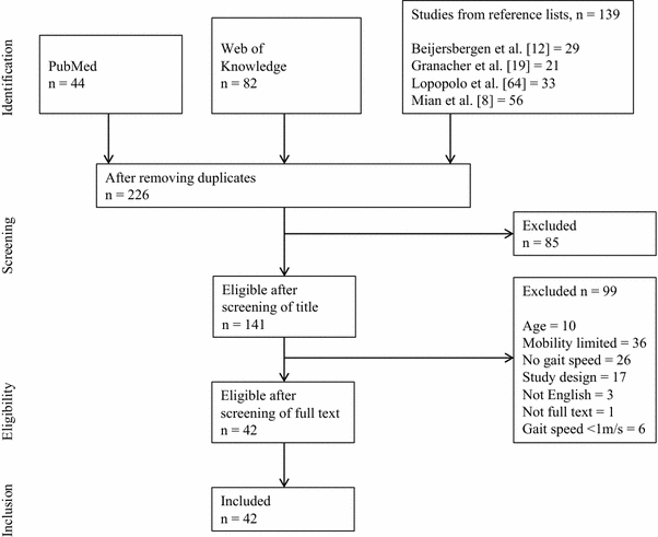 We scanned each article’s reference lists in an effort to identify additional suitable studies for inclusion in the database, including reviews [8, 12, 64]. In addition, relevant journals within the sections gerontology/geriatric medicine (e.g., Age and Ageing, Gerontology, Journal of the American Geriatrics Society, Journals of Gerontology) were searched for the terms ‘training’ OR ‘intervention’ AND ‘gait speed’ OR ‘walking speed’. Duplicates between searches were removed. We also applied additional filters to exclude studies that were published in non-peer reviewed journals; failed to use at least one measure of gait speed; failed to report the pre–post means and standard deviations numerically or in a graphic form; were case reports; or failed to report or administer minimum requirements regarding training design such as exercise volume, frequency, and intensity. We also note the application of a unique filter, gait speed, our main outcome variable. Because this review targets healthy old adults, we set a minimum pre-intervention gait speed, as recommended for this population in the literature, at 1.0 m/s [10, 59, 85] but lower than 1.0 m/s for tests that included postural tasks and walking on a curved path (i.e., timed-up-and-go test [TUG]) [86]. We also excluded studies that used an active control group. Three independent reviewers (ML, MG, UG) screened citations of potentially relevant publications based on the inclusion and exclusion criteria. If the citation showed potential relevance, it was screened at the abstract level. When abstracts indicated potential inclusion, full-text articles were reviewed for inclusion. A consensus meeting was held with TH if the three reviewers were not able to reach agreement upon inclusion of an article.