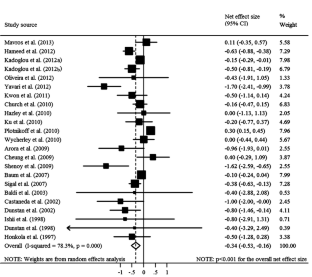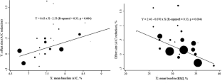 The effect size in each study was pooled with a random-effects model. Analyses were stratified by several key characteristics of the patients and RT exercise programs; meta-regression analysis was then used to detect a difference in the effect size among strata within each factor. Linear regression analyses were added by entering each of the following profiles: patients’ baseline characteristics [mean baseline age, body mass index (BMI), and HbA1c levels] and exercise characteristics (total sets per week, total sets per bout of exercise, frequency, and intensity).