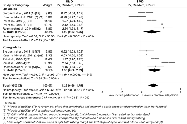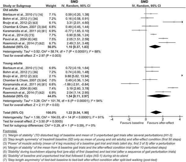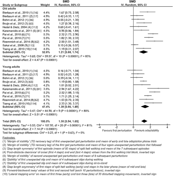 The SMDs from all relevant studies were pooled in a meta-analysis to estimate the weighted average effect size [66, 67, 68] of (a) the general locomotor adaptability, (b) the predictive adaptation and (c) the reactive adaptation. We used a random-effects model of the generic inverse variance method, which gives more weight to larger studies (i.e., smaller standard errors) and accounts for heterogeneity of the included studies to calculate the weighted average effect size [66, 69]. To analyze the presence of an overall effect of locomotor adaptability as well as predictive and reactive adaption, a test statistic (i.e., z test; null hypothesis: no overall effect of the experience of repeated movement perturbations) was applied [66, 70]. A subgroup analysis that included a difference test [66, 70] was conducted for the factor age group (i.e., older vs. young adults), using the respective control group of young adults if available in the study. To avoid a risk of bias in terms of a repeated inclusion of the same participants, not all studies are present in the meta-analysis. The data reported by Pavol et al. [46], Pai et al. [37], Pavol et al. [40] and Pai et al. [71] were merged and included only once as they refer to the same participants, indicated by the equal number and anthropometrics (i.e., data taken from Pavol et al. [40] and Pai et al. [71]). Furthermore, regarding the studies of Yang and Pai [61], Bhatt et al. [72], Pai et al. [73, 74], only the data from Pai et al. [73] (predictive adaptation) and the data from Pai et al. [71] (locomotor adaptability and reactive adaptation) were considered in the meta-analysis since the experiments of the other studies were based on the same participant pool (as confirmed by one author). The means and standard deviations reported by Pavol et al. [40], Pai et al. [71, 73] were visually extracted from the respective graph. Forest plots were created separately for the general locomotor adaptability as well as predictive and reactive adaptation including the age subgroups, to illustrate the SMDs and 95 % confidence intervals (CIs) for all respective studies as well as the overall effects. Further, heterogeneity between study outcomes was investigated using Q and I 2 statistics to assess if differences between outcomes are due to study diversity rather than chance [75]. Statistical procedures as well as forest plots were performed by means of the software Review Manager v.5.3 [76].