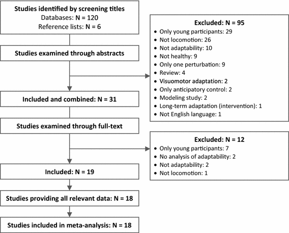 The search was performed by using the electronic bibliographic databases Web of Science, MEDLINE, Embase and Science Direct (inception to January 2015) and by manually screening the reference lists of the eligible articles. Sets of terms relating to adaptability (adaptation, adaptive, adaptational, adaptability, adjustments, modifications, responses), motor control or behavioral effect (feedforward, feedback, proactive, predictive, reactive, aftereffect, after-effect, after-effects), subjects (old, aged, age, aging, ageing, senior, elderly) and locomotion (walking, walk, gait, run, running, sit-to-stand, stand up, transition, stability, split-belt) were combined in the database search (see Electronic Supplementary Material Appendix S1). Each term was mapped to MeSH (Medical Subject Headings) and controlled terms, respectively.