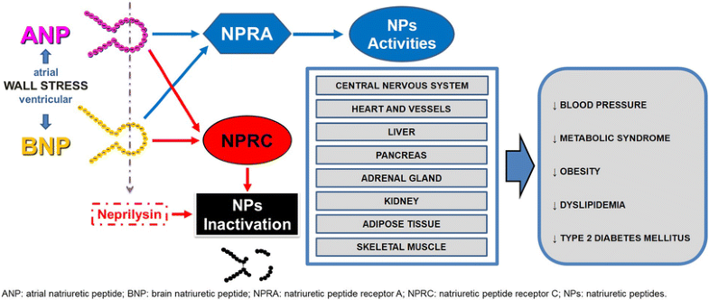 Despite considerable progress in Medicine, CVDs still represent the main cause of morbidity and mortality worldwide. In the last decades, the increased knowledge about cardiac NPs system has sharply clarified their important role in CVDs, linking glucose and lipid dysmetabolism with higher BP as well as CV events and mortality. In the next future, NPs may play a crucial role in the management of CVDs as diagnostic/prognostic biomarkers and, using tailored cardiac NPs, as possible therapeutic agents [107]. It is very likely that a clearance receptor (NPRC)-blocking drug will improve both metabolic and CV disorders. The relevance of cardiac NPs in cardiometabolic diseases appears to increase year-by-year in clinical practice. The main obstacle in the correct interpretations of circulating NPs values is represented by the continuous resetting between ANP and BNP peripheral activities and cardiac secretion, both in physiological and pathological conditions. This requires the contemporary assessment of many cardiac parameters, including diastolic function and right heart parameters, as well as renal function together with cardiac NPs assays. Only in some HF patients, the massive NPs secretion appears to overcome the functional cardiac resetting, leading to important consequences including cardiac cachexia [108]. Keeping in mind these practical limitations, the predictive role of cardiac NPs may also be useful to detect subclinical damage in asymptomatic individuals, thus improving CV risk stratification and prevention. The multiple effects exerted by NPs have raised the interest for the development of new therapies for the treatment of extremely frequent conditions such as hypertension and HF. Therefore, the development and administration of recombinant NPs first (Nesiritide, Carperitide and Ularitide) and then of designer NPs (Vasonatrin, Cenderitide, ANX042 and ZD100), as well as the recent clinical use of a new class of combination drugs, which inhibits both angiotensin II receptor and neprilysin activities (ARNI), led to encouraging results, in terms of efficacy and safety in different settings [107]. It is important to remember that ARNI, by reducing NPs degradation and angiotensin II activity, is not only an innovative and landmarking drug in HF patients [76, 109], but it is also a potent antihypertensive agent [110]. It is hoped that pandemic conditions, such as hypertension, obesity and MetS, could benefit from a NPs-based approach, both for diagnosis and for treatment, in the near future.
