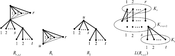 R r,s,t , the subgraphs R 1 and R 2 of R r,s,t , the line graph L(R r,s,t ) of R r,s,t