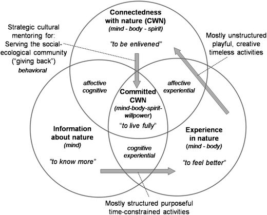 Conceptual framework of key components comprising connectedness with nature (CWN). Depicts CWN as comprising: information about nature; experience in nature; connectedness with nature; and committed connectedness with nature. Information about nature is primarily based on cognitive concepts, intellect, and information as obtained through education or media to satisfy the mind’s curiosity and increase knowledge [103]. Experience in nature includes outdoor sports and recreation, facilitated eco-adventure and field trips, and is usually sought after to help the body and mind feel better or to support experiential learning [103]. Such activities are often (semi-) structured and constrained by time or have a particular purpose. In contrast, CWN is often (unintentionally) realized through unstructured activities which are free from strict time constraints or targeted outcomes. CWN arises through affective experience following, for example, extended nature immersion and may inspire and enliven one’s spirit. Committed (or “deep”) CWN refers to the sustained embodiment of this tripartite as a behavioral set aimed at serving social and ecological communities through transformative leadership [34, 103]. According to Young [103], individuals may best achieve this committed (deep) CWN through an intentional process of being strategically mentored as part of a culturally embedded process [103]. The conceptual framework (this figure) highlights that CWN requires balancing faculties of mind, body, and spirit (i.e., one’s source(s) of inspiration) to generate willpower aimed at actualizing "self" and being of service to others