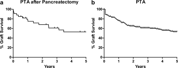 Thirty-day perioperative mortality of TPIAT is 0–1.2 %, with overall long-term (5- and 10-year) survival of 90–94.6 % and 81–84 %, respectively, with incremental improvements observed over time [2••, 3••, 4••]. For patients struggling with exocrine insufficiency and diabetes, there is a risk of mortality due to narcotic and carbohydrate absorption issues [20, 21•]. Five- and 10-year patient survival rates for PTA in Type 1 diabetics is 90.7 and 74.4 %, respectively [22•]. The existing literature on PTA for 3c diabetes is devoid of long-term data, but 3-year patient survival is 89 % [10].