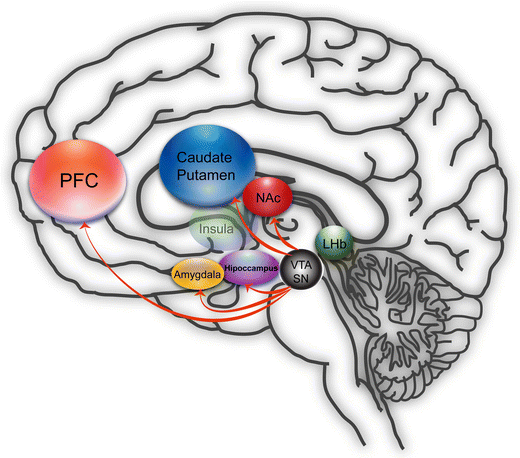 Several other circuits have been implicated in the neuroadaptive changes of the addiction cycle. The dorsal striatum may play a significant role in the cue- or context-dependent craving given its role in habit learning and action initiation [12••]. The right dorsolateral and inferior frontal cortices have demonstrated increased activation in cocaine users after an intravenous injection of cocaine, with a coincident improvement in a motor response inhibition task [18]. Hence, some of the acute effects of cocaine could be related to a transient reversal of the chronic hypofunction in the impulse control circuitry. The amygdala plays a pivotal role in both structural and functional adaptations that underlie drug-related memories [19]. And the anterior insula, reciprocally connected to several limbic regions including the ventromedial prefrontal cortex, amygdala, and ventral striatum, appears to integrate autonomic and visceral information with emotion and motivation, and therefore may be involved in motivational processes that promote addiction, such as conscious urges and the decision to relapse [20]. Indeed, insular reactivity has been suggested to serve as a biomarker to help predict substance abuse relapse [12••]. Finally, glutamatergic inputs from the LHb to the VTA have also been implicated in the pathophysiology of addiction [21]. Inhibition of dopaminergic VTA signaling by the LHb enables learning avoiding behaviors when an aversive stimulus or negative feedback is provided [10•]. The chronic use of addictive drugs leads to habenular hyperactivity, which may promote a negative emotional state during drug withdrawal [10•].