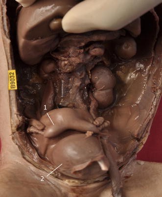 Autopsy picture showing hydrometrocolpos with uterus didelphys (1) and distended bladder (2)