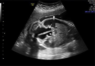 Sagittal view of the fetal pelvis and abdomen showing a septate cystic mass connected to two dilated uterine cavities (arrows) with the characteristic four-chamber appearance. Also note the presence of fetal ascites (arrowhead)