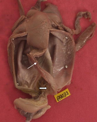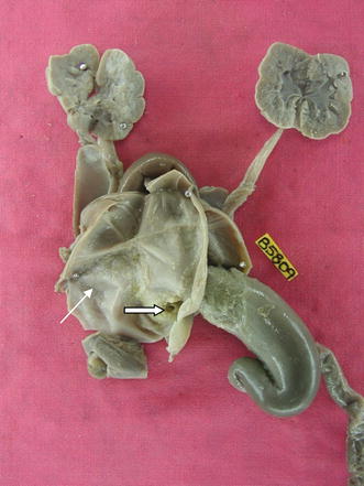 Cut section of distended vagina (thin arrow) showing a colovaginal fistula (thick arrow) with meconium staining at the fistulous opening