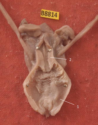 Cut section of hydrocolpos. Vagina (1); Uterus (2)