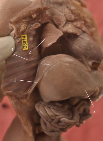 Autopsy image showing diaphragmatic eventration and hypoplastic lungs. Diaphragm (1); Lung (2); Liver (3)